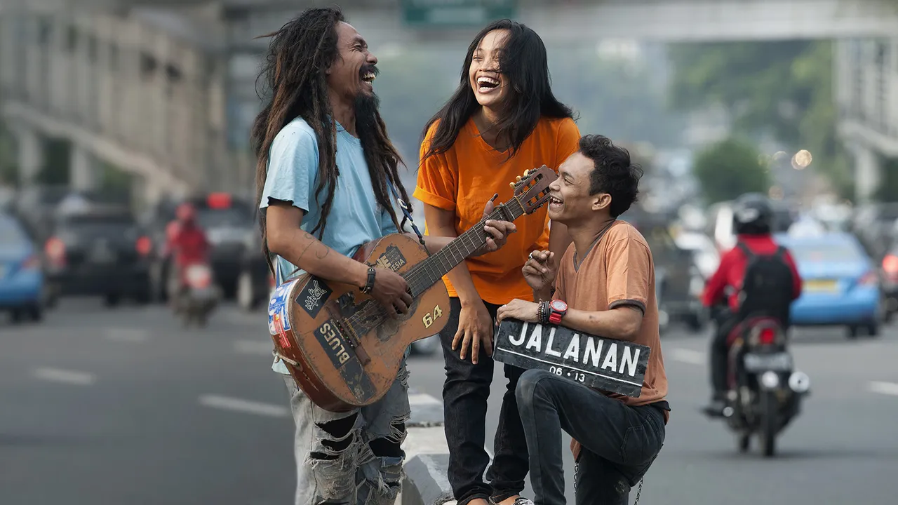 JALANAN ("Streetside") erzählt die fesselnde Geschichte von Boni, Ho & Titi, drei begabten Straßenmusikern in Jakarta über einen Zeitraum von 5 turbulenten Jahren in ihrem eigenen Leben.
